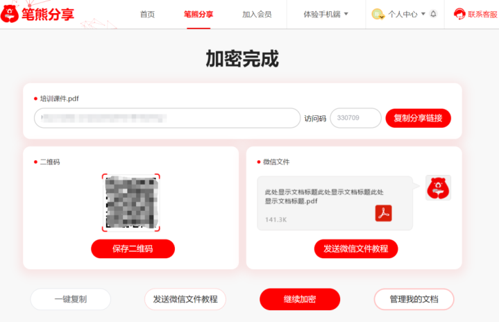 4.设置完点立即加密即可生成加密链接、二维码、微信文件等文件格式,选择您需要的格式分享即可。