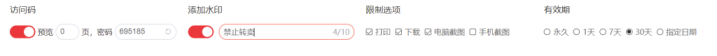 3.设置限制选项里面勾选,打印、下载、电脑截图、手机截图(限制手机截图状态下默认限制手机录屏),添加专属水印保护知识产权。